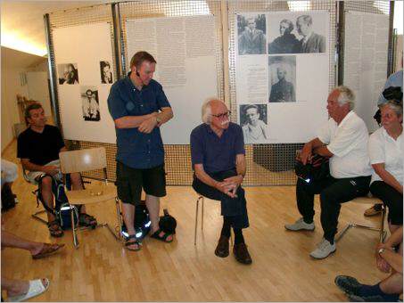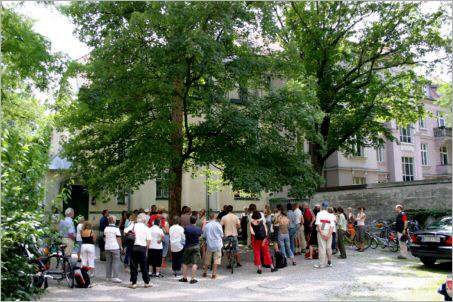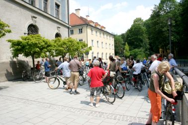 Um 11:00 ließen sich die inzwischen 60 eingetroffenen Radler von einem Platzregen auf dem ersten Abschnitt ihrer Tour nicht abhalten. Erste Station waren die Gräber von Christoph Probst, Hans und Sophie Scholl, Alexander Schmorell, Harald Dohrn und Hans Leipelt. Vorbei am Gerichtsgefängnis und Hinrichtungsort Stadelheim, dem Untersuchungshaftgefängnis Neudeck ging es über die Stationen: Kongresssaal Deutsches Museum, Justizpalast, ehemalige Gestapo-Leitstelle, Wohnung von Hans und Sophie Scholl in der Franz-Joseph Str. 13 zur "Denkstätte Weiße Rose", gleich neben dem Lichthof der Ludwig-Maximilians - Universität. Der etwa 60 köpfige Tour-Schwarm mit dem Frontradler Chaussy mit Headseat und Lautsprecher auf dem Gepäckträger mag auf manchen Betrachter wie eine Radldemo gewirkt haben. Die Er-Fahrradung von Geschichte, ausgedehnt auf 17 Kilometer kam gut an - nur zwei Tourteilnehmer verabschiedeten sich aus Zeitnot vor dem spannenden Schlussgespräch in der "Denkstätte Weiße Rose". Dort nämlich stellte sich Franz Josef Müller, Teilnehmer der Weißen Rose - und Ehrenvorsitzender und Grümder der Weißen Rose-Stiftung e.V. den Fragen der Radltour-Teilnehmer.